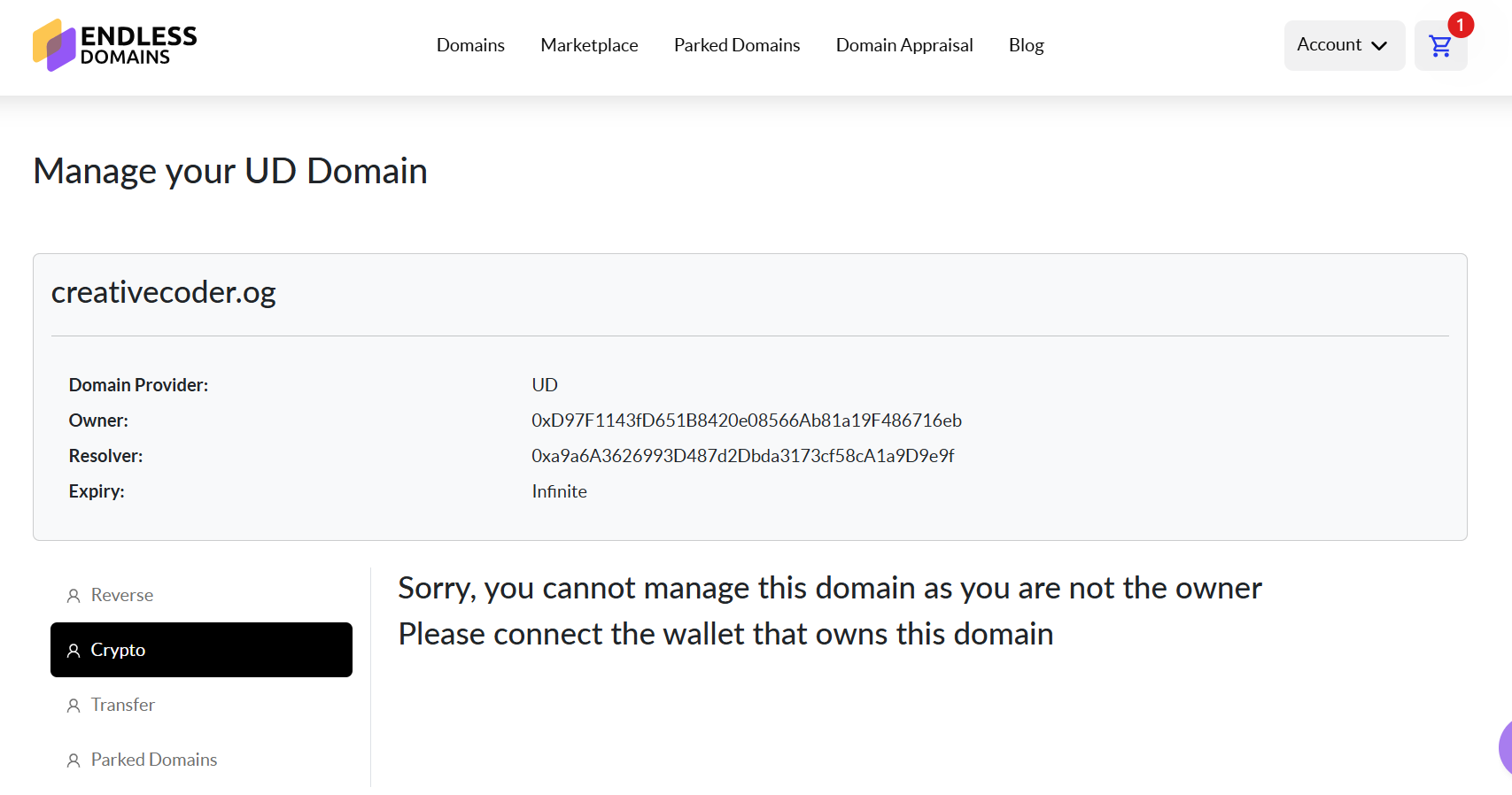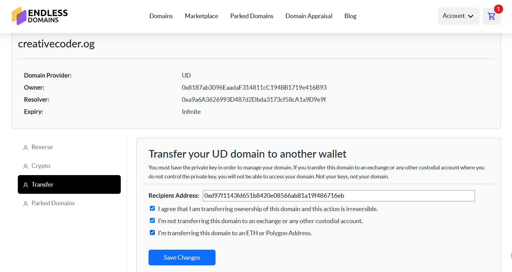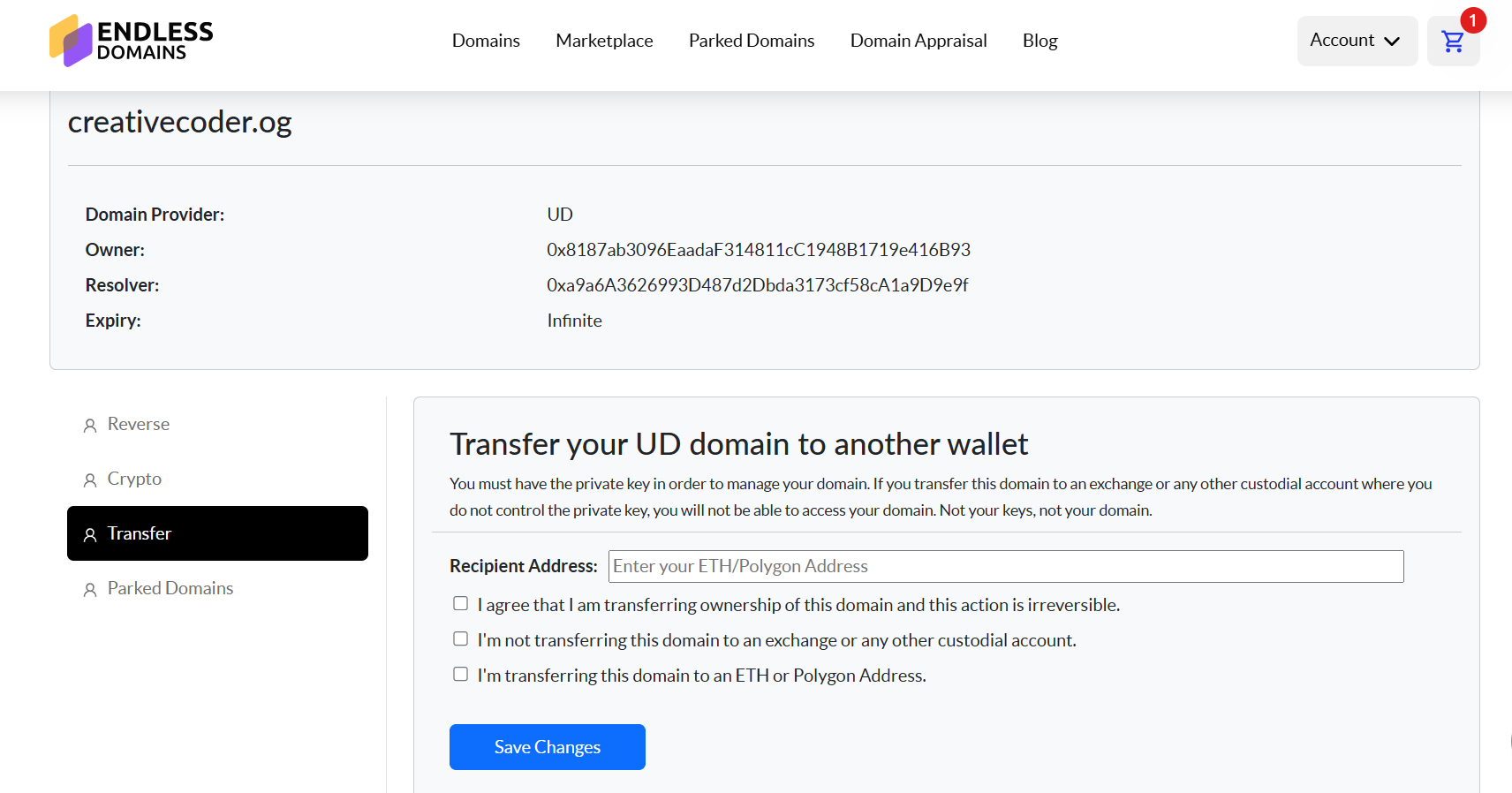Important: You must have access to the private key of the destination wallet. If you transfer your domain to an exchange or a custodial wallet where you do not control the private key, you will lose access to your domain. As the saying goes: “Not your keys, not your domain.”