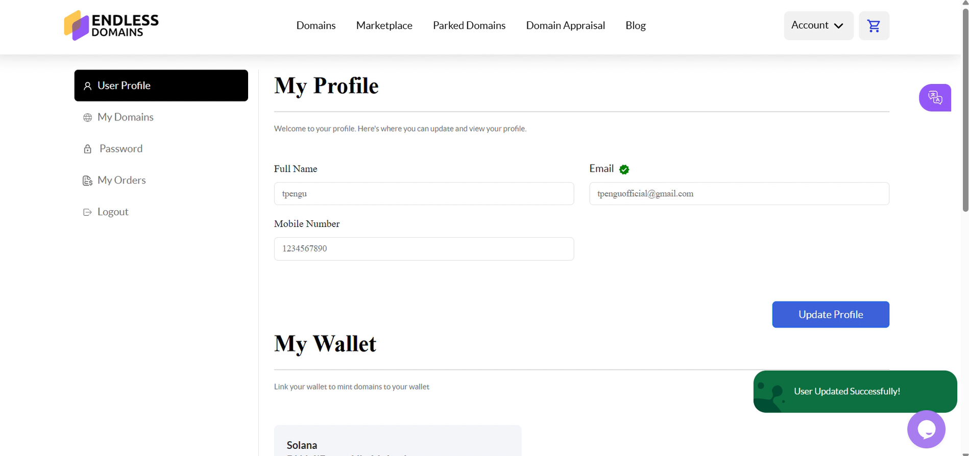 You can update your account details anytime through the User Profile section of your Endless Domains account. This includes information such as your display name, contact details, or other profile settings.